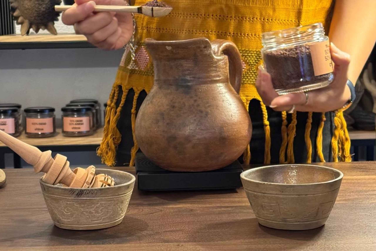 Durante esta experiencia conocerás el chocolate artesanal mexicano a través de una degustación guiada inspirada en la tradición oaxaqueña. Probarás chocolate de 0% azúcar, barras de 70% cacao y chocolate en polvo con azúcar o sin azúcar, para identificar sus aromas y sabores. Utilizaremos utensilios tradicionales de la cultura mexicana, como el molinillo, jarras de barro, y hablaremos brevemente sobre el origen del cacao en México. Finalizaremos con una taza de chocolate caliente o fría, según tu preferencia, preparada al momento.