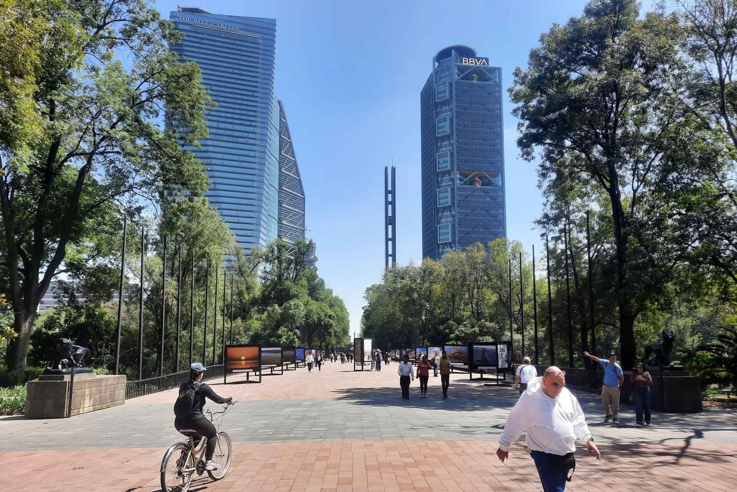 Then we'll leave the park and stroll along the famous Paseo de la Reforma, one of the most magnificent avenues in the world. Here, modern architecture lines up with historical monuments. You'll pass the striking Estela de Luz, a 104-meter-high stele that symbolizes the struggle for Mexico's independence. Check out the elegant Fuente de la Diana Cazadora, one of the city's most beautiful fountains. The tour wraps up at the majestic Ángel de la Independencia, the iconic symbol of Mexican independence.